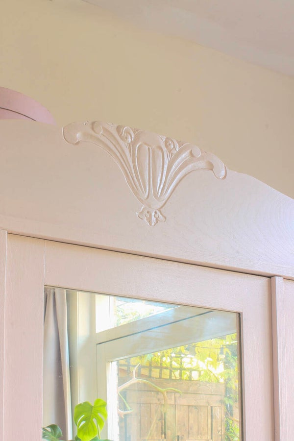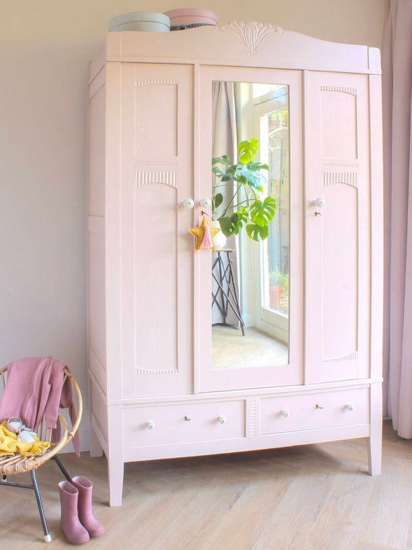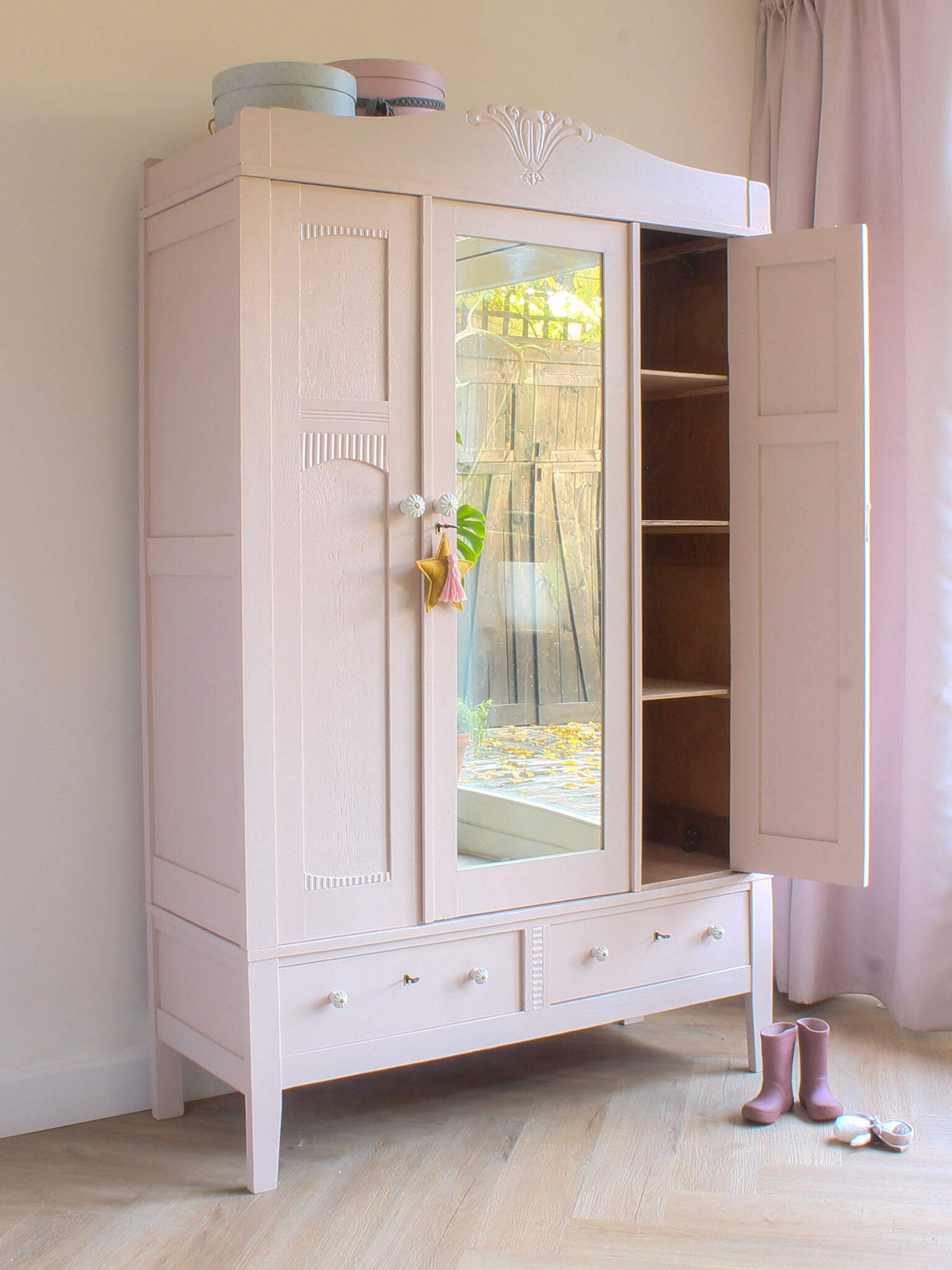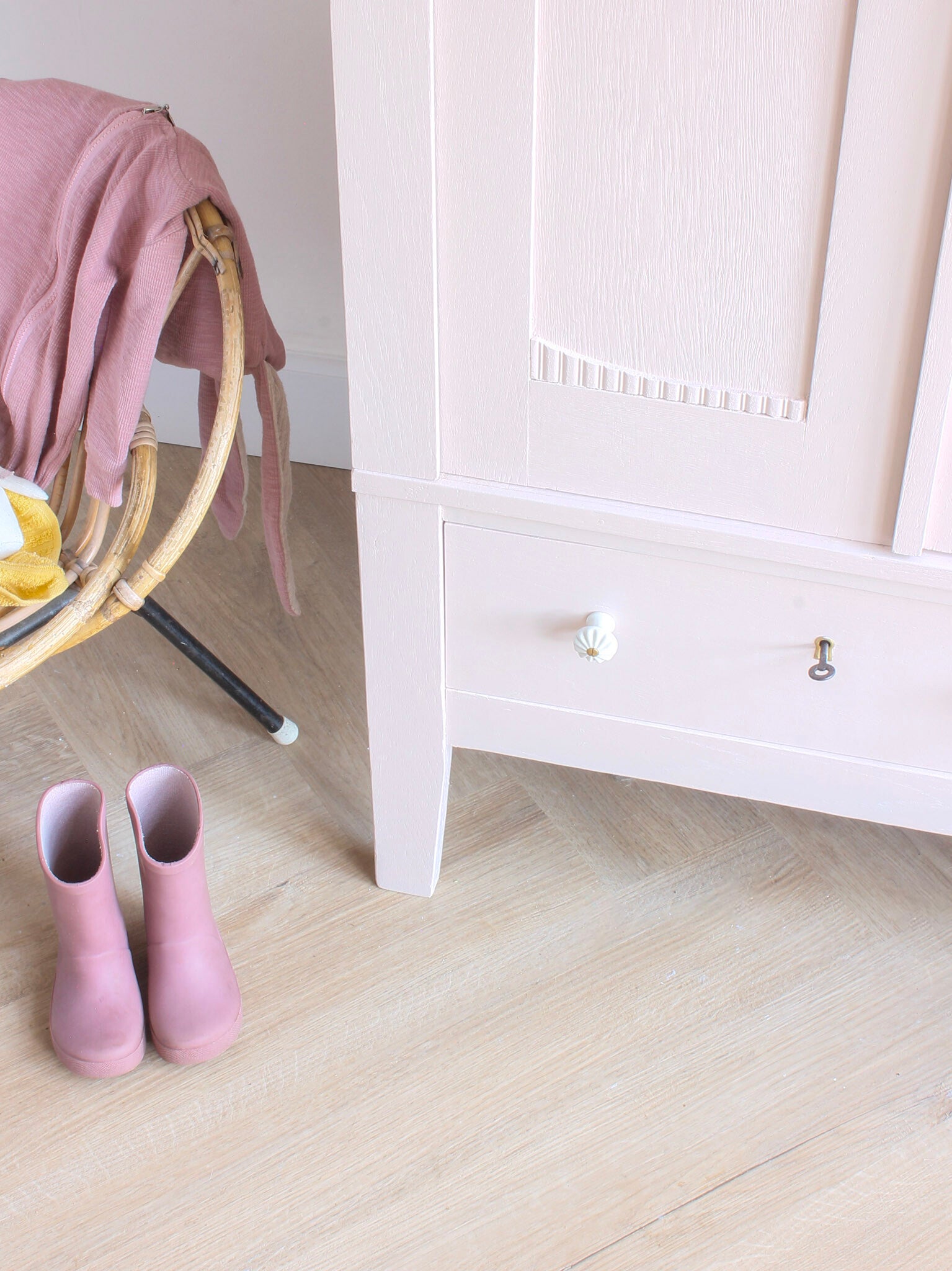 Verder is ze geschuurd, gegrond en meerdere keren in de verf gezet in de kleur Schermerroze van Flexa, uitgevoerd in een professionele kwaliteitsverf.