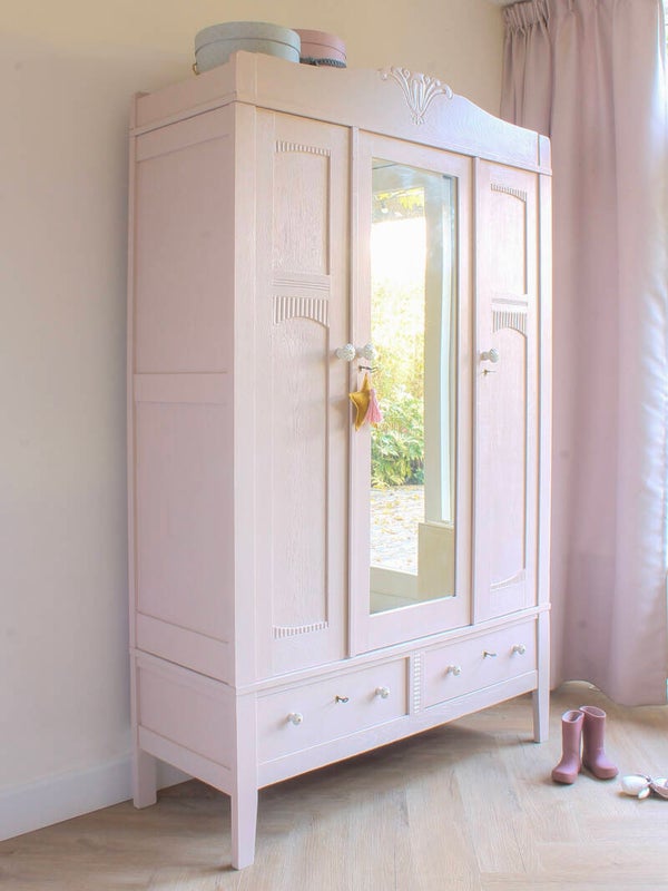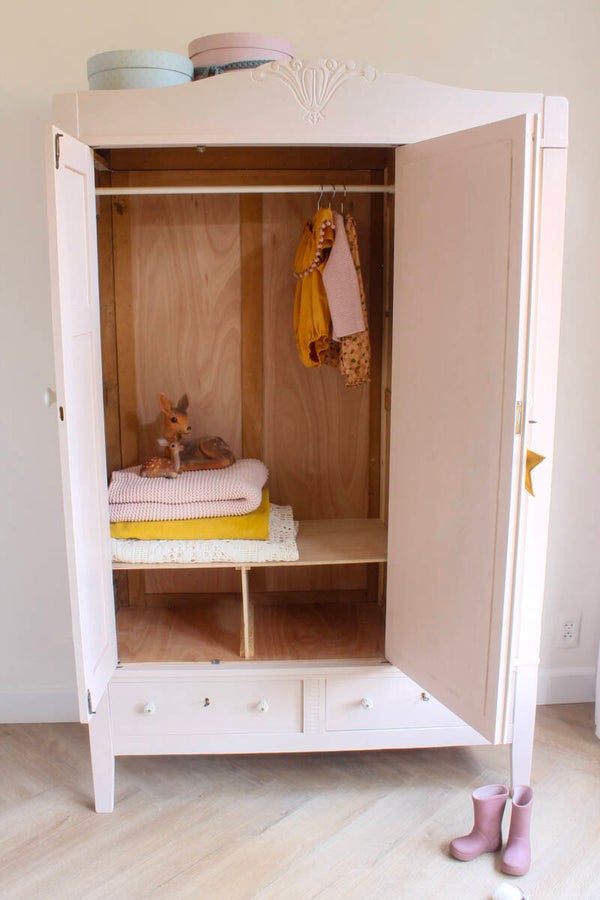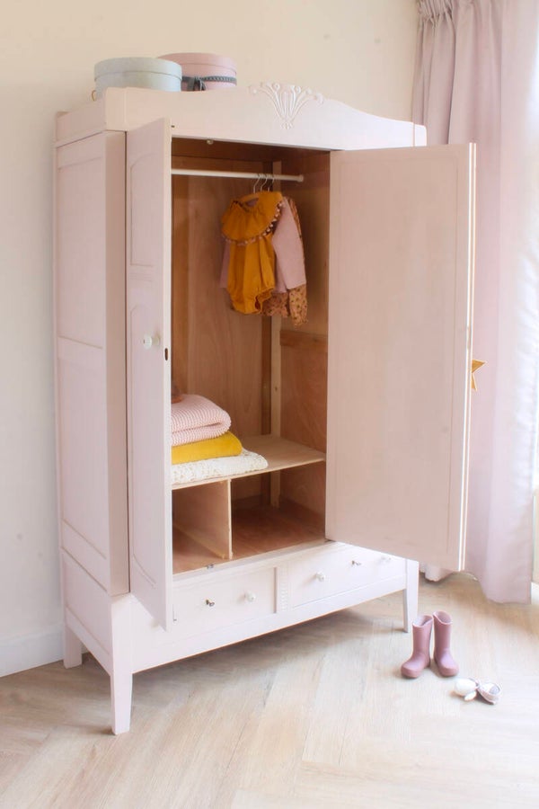 Lore is de perfecte kast voor op de baby- of kinderkamer. Het mooie houtsnijwerk en de porseleinen knopjes geven haar een romantische uitstraling.
