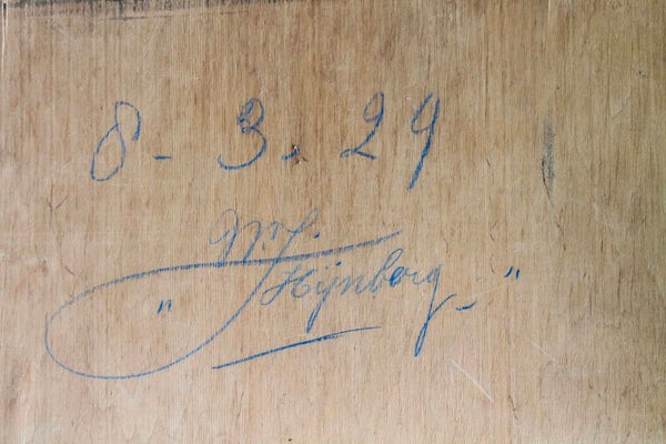 Aan de binnenkant van de spiegel vonden we de datum van de kast, 8 maart 1929 en de naam van de originele maker, M.J. Hijnberg. We hebben dit leuke detail bewaard en op de achterkant van de kast bevestigd.