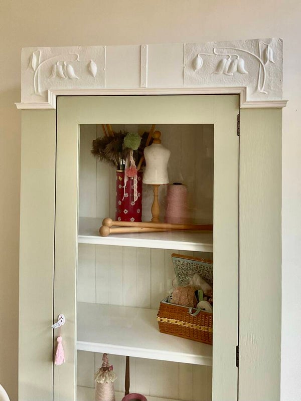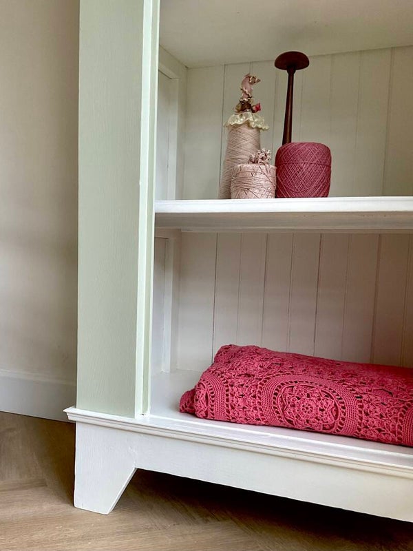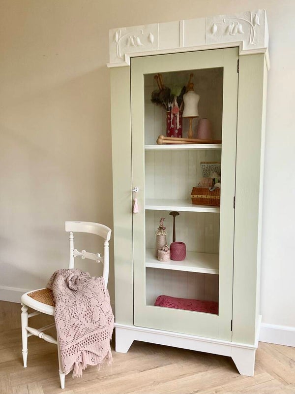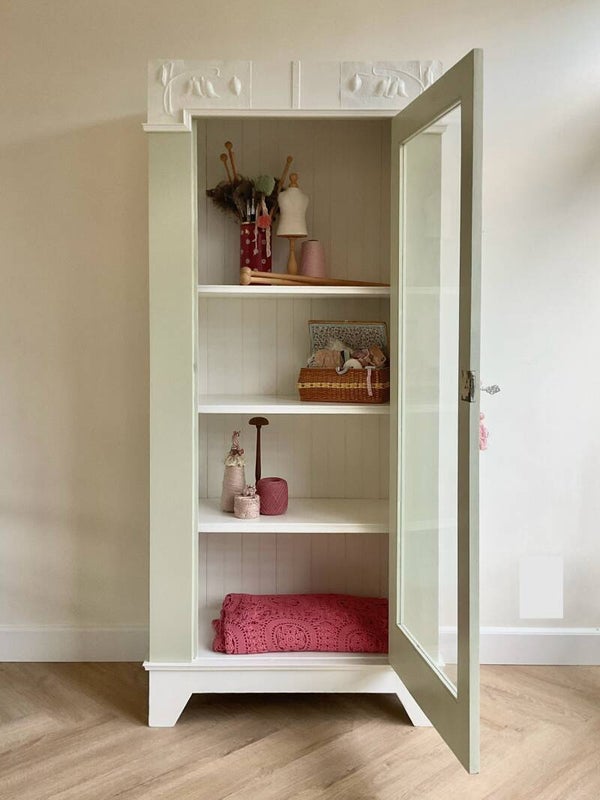 We hebben de vitrinekast helemaal uit elkaar gehaald en daar waar nodig hardware. Daarna hebben we haar grondig schoongemaakt en behandeld tegen houtworm, geschuurd, gegrond en de sierlijsten vernieuwd. Als laatste nog de verf erop en Melea is klaar voor een nieuw avontuur!