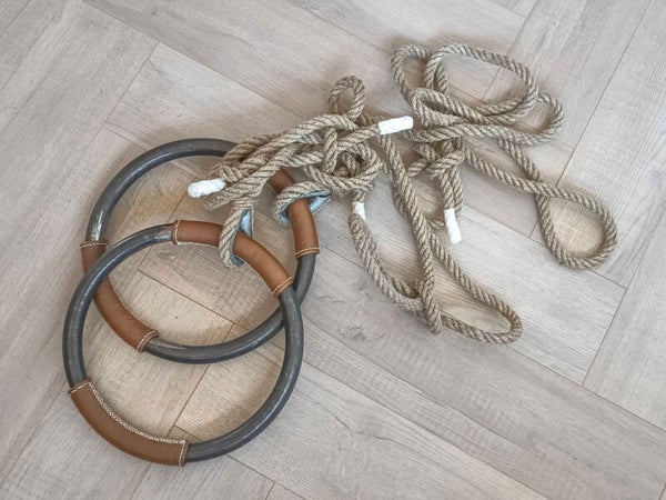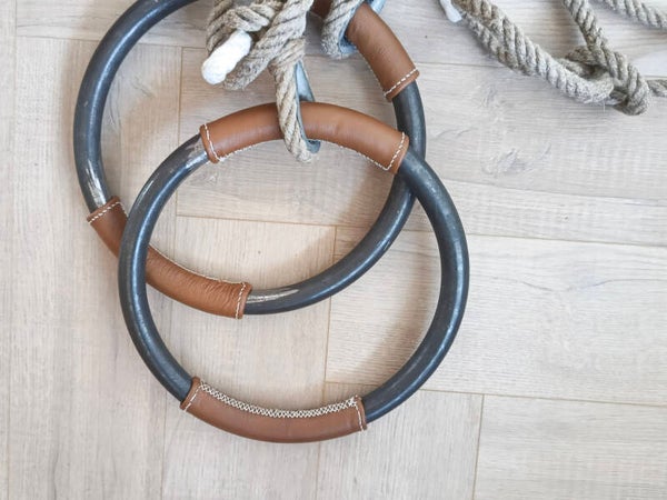 De stalen ringen zijn Ø 28 cm, en hebben we omzoomd met leren banden voor betere grip.