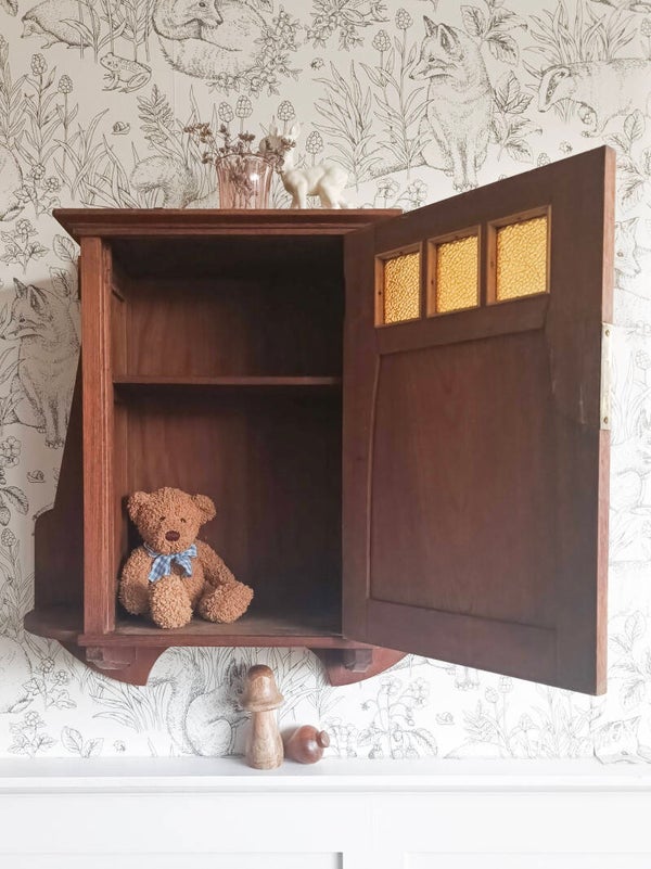 Het kastje heeft een legplankje binnenin en twee plankjes aan de zijkanten. Mooi geel gekleurd glas in het deurtje en een mooi ingelegd versiersel.