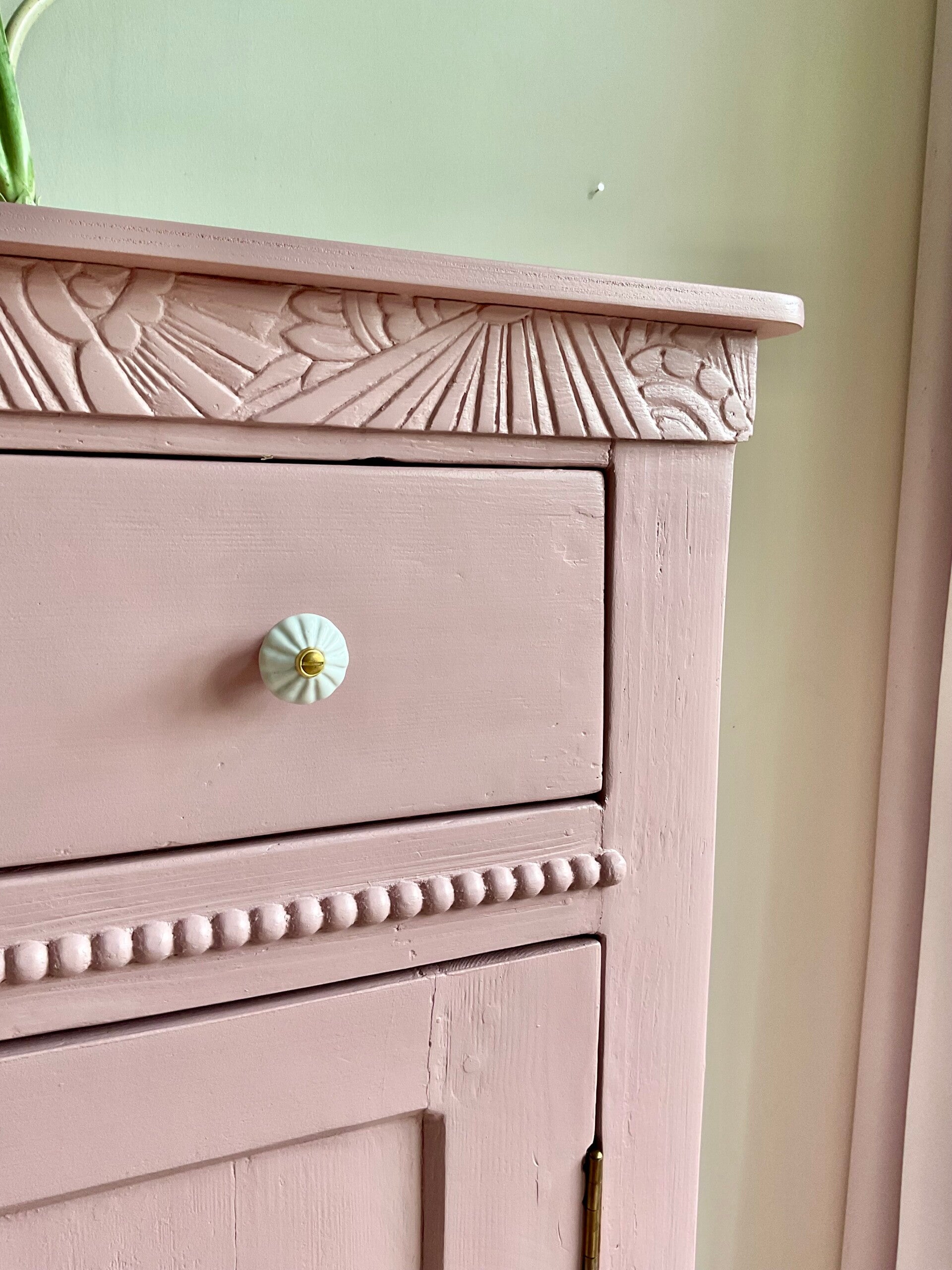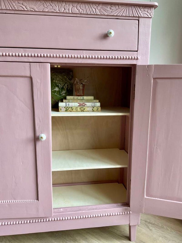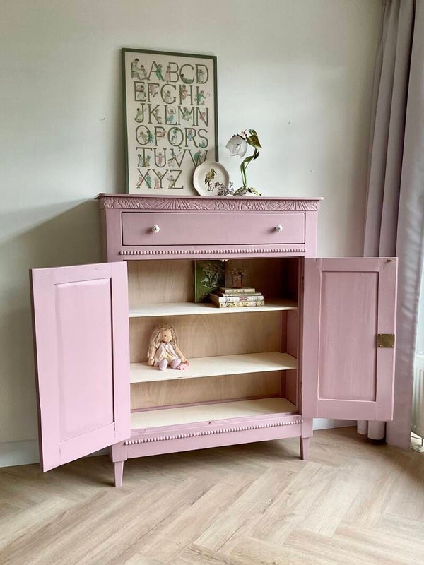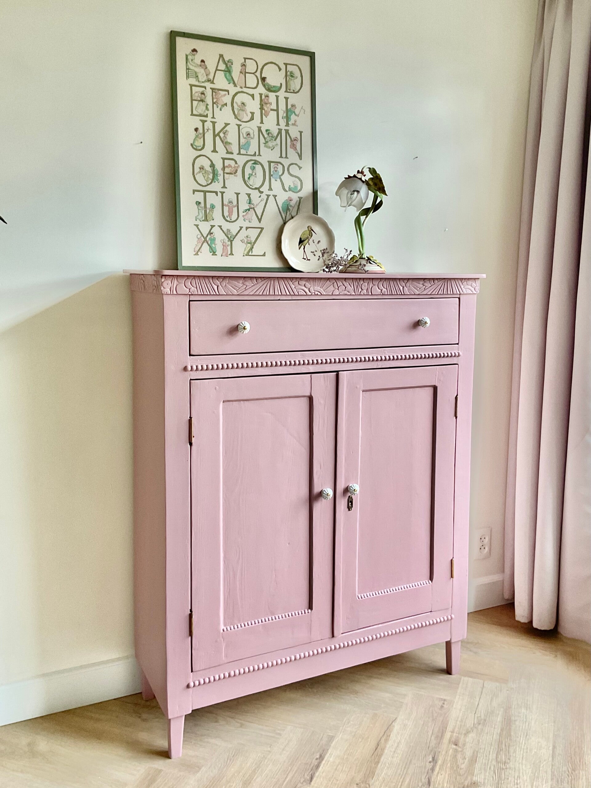 Wat een leukerd is deze meidenkast geworden, perfect om spullen in op te bergen! Met de bobbin sierlijsten (bolletjes dus) en die mooie plum kleur is dit oudje weer helemaal hip.
