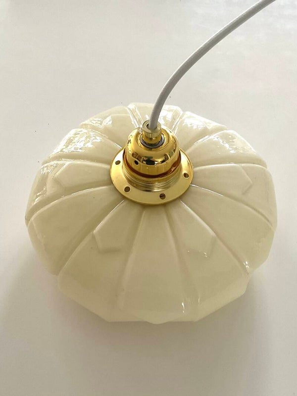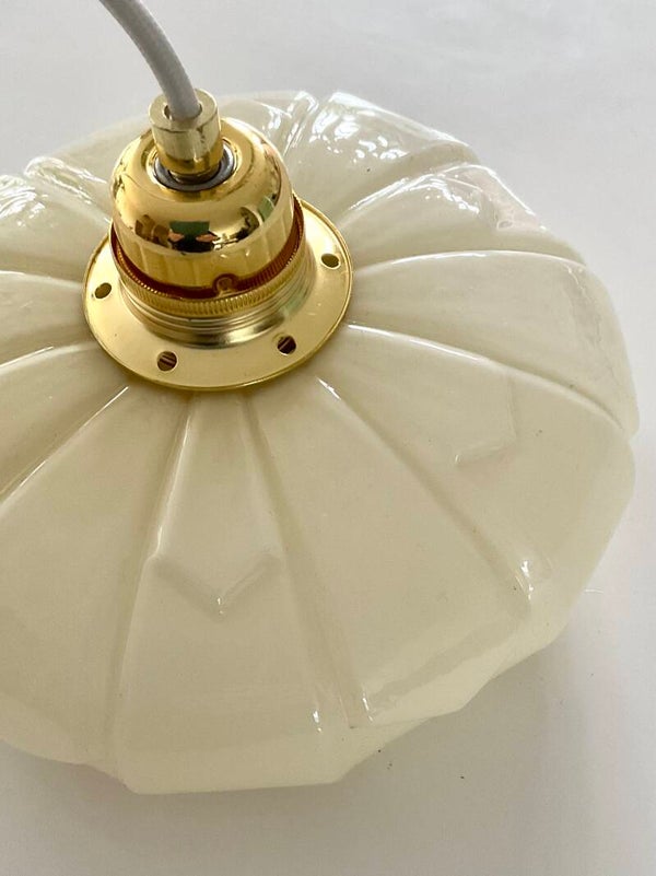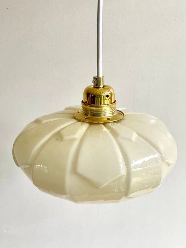 Een vintage hanglampje van off white kleurig glas. En kijk die mooie vormen erin!