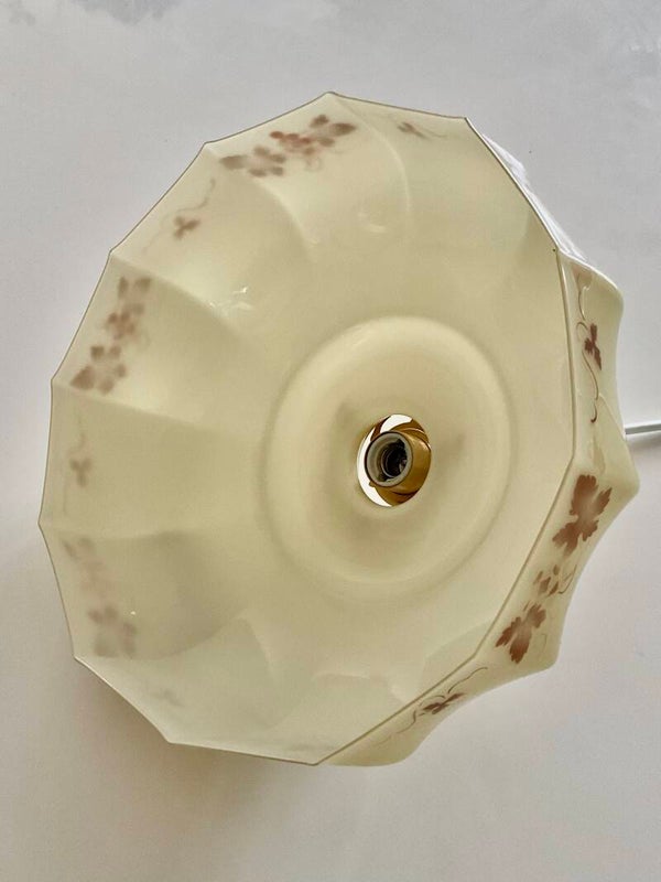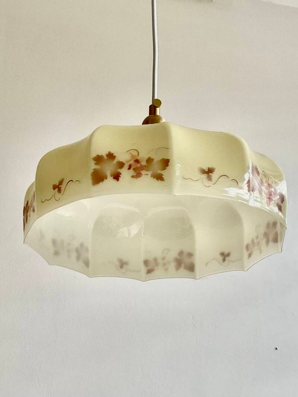 Dit mooie vintage hanglampje heeft een kapje in een zachtgele kleur met een print van druivenranken. De golvende lijnen geven het lampje een speels karakter.