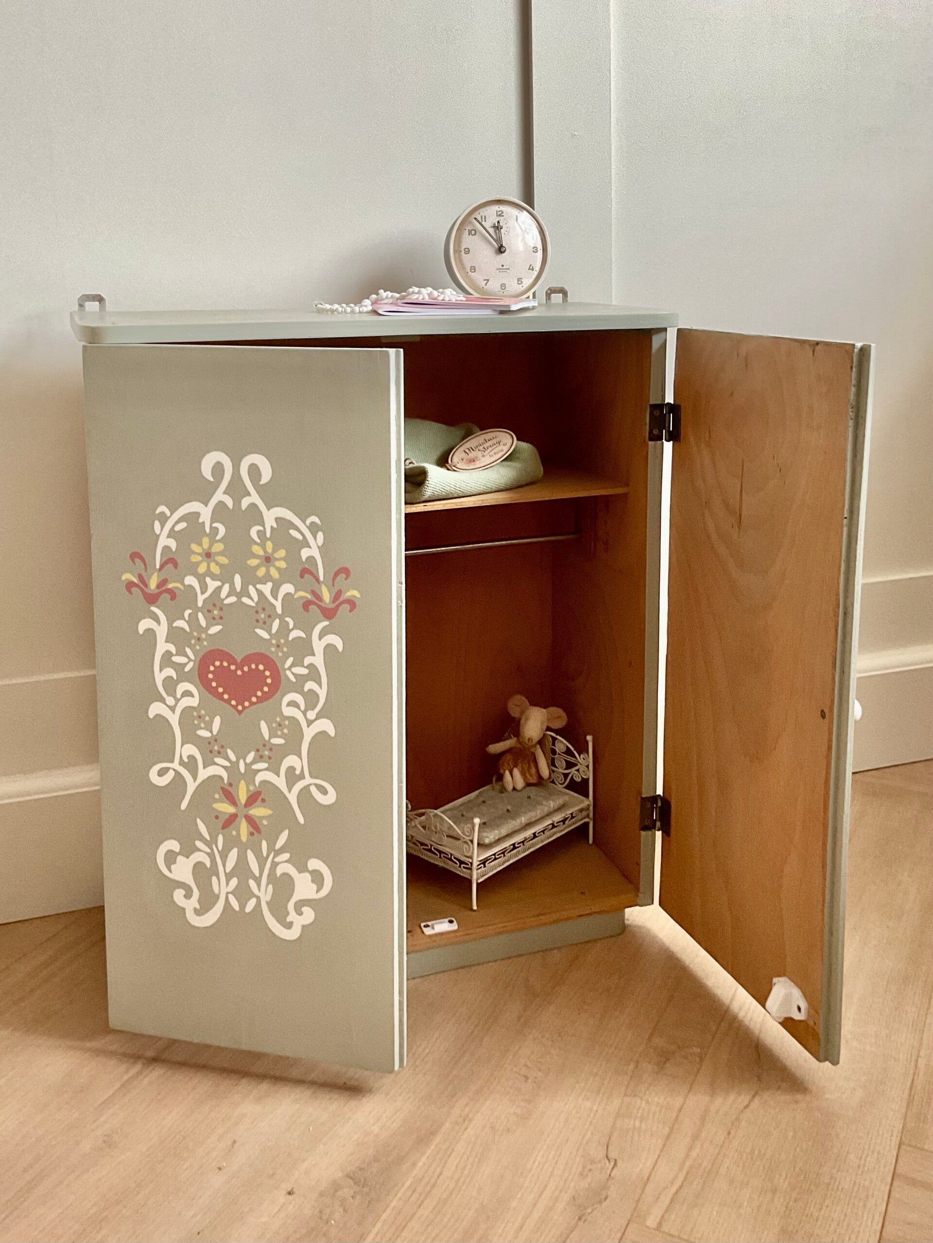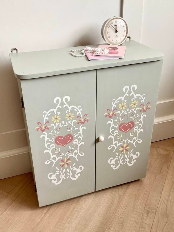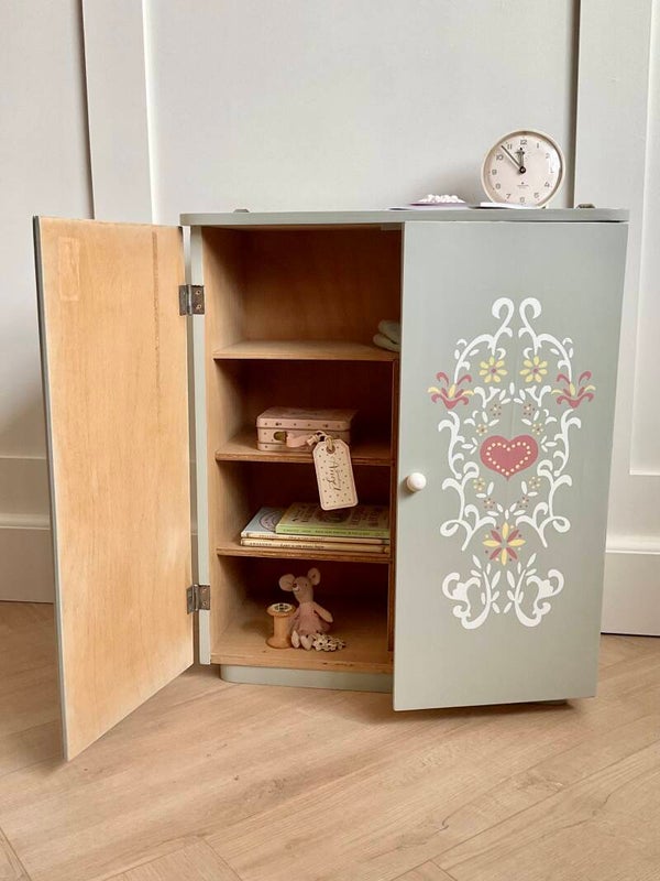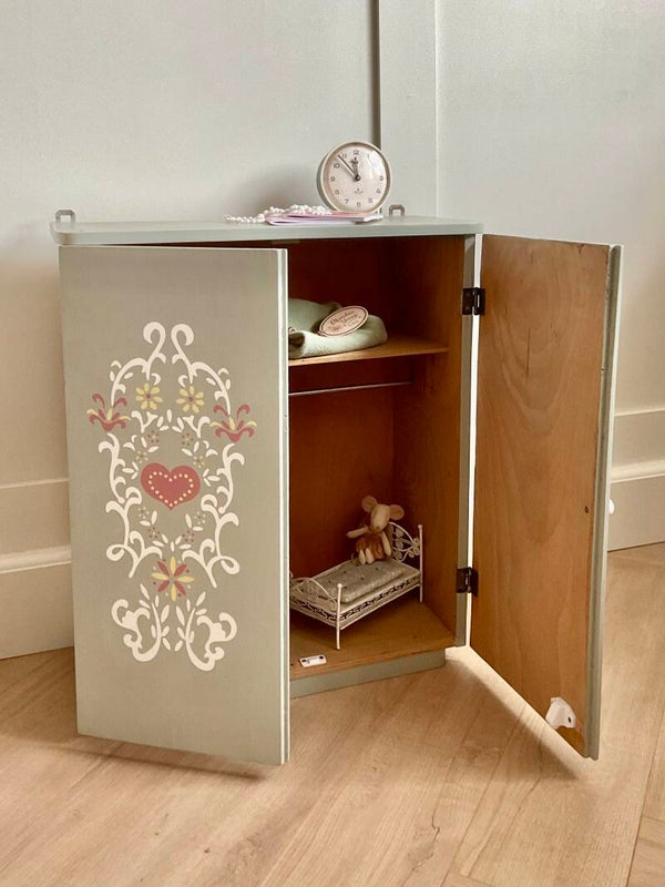 Dit oude kledingkastje voor de poppenkleertjes is geweldig in de kinderkamer.