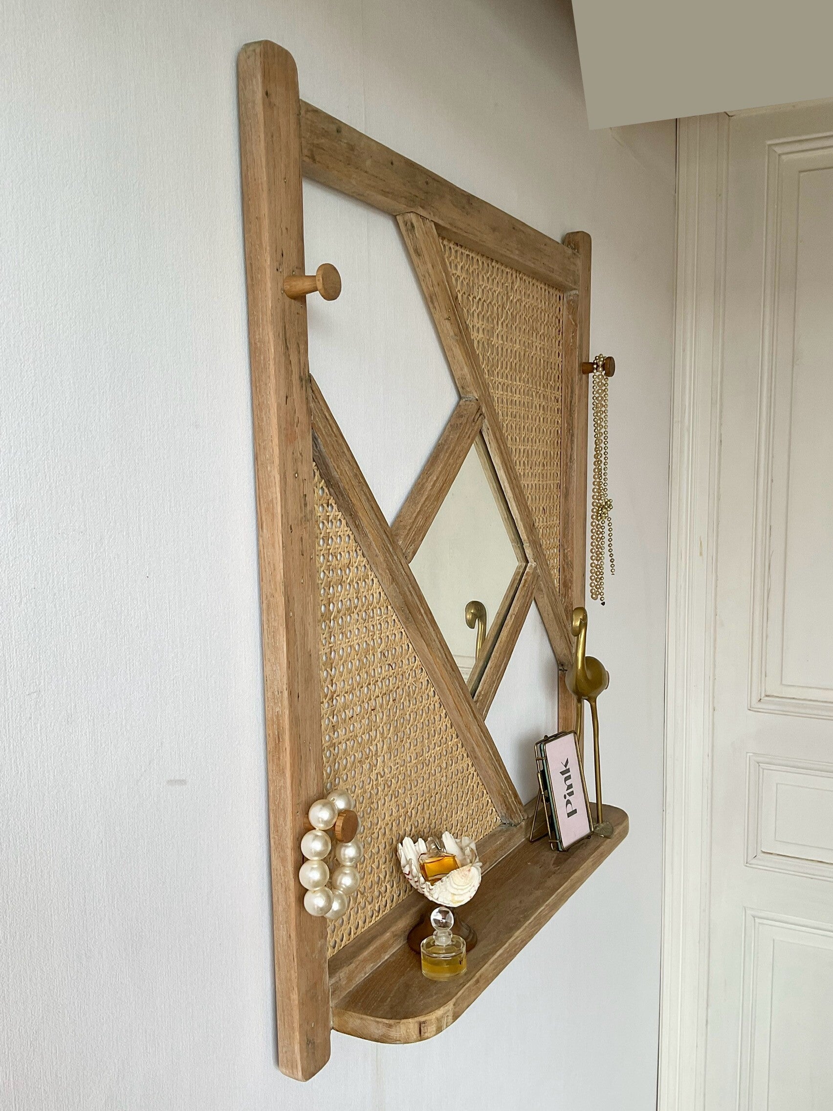 Mooie vintage kapstok met spiegel in een lichte houtkleur en webbing. Leuk voor boven de commode of in de gang.