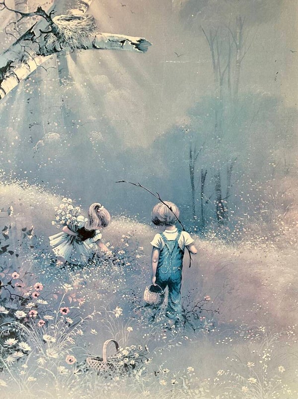 Super schattige print van de Chileense schilder Andres Orpinas van twee bloemen plukkende kinderen.