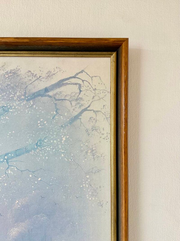 In blauw en roze tinten. Met mooie lijst afgezet met goudkleurige band.In nieuwstaat