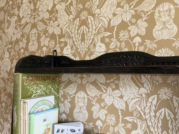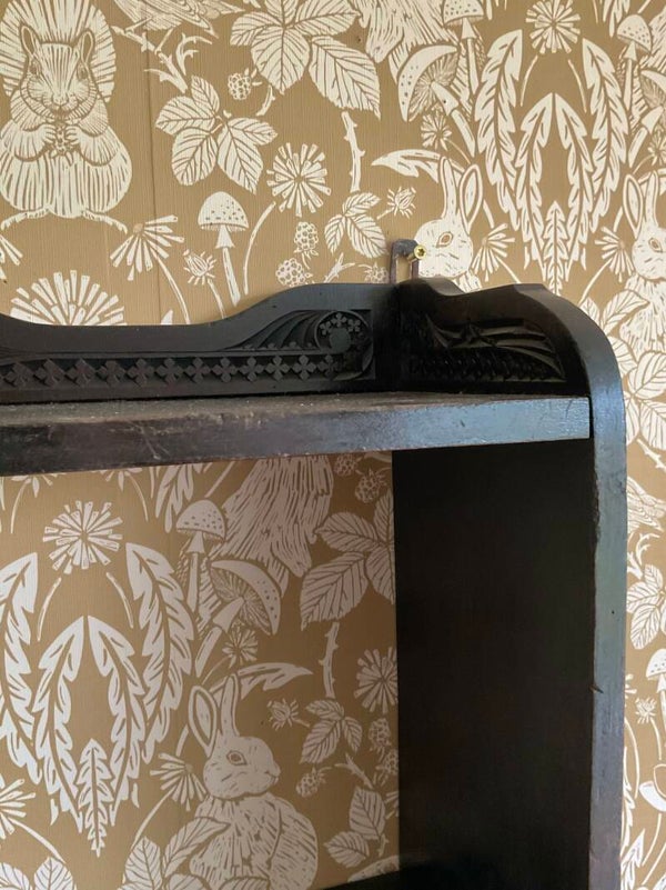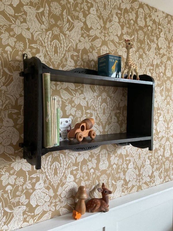 Het wandrekje is van hout en heeft heel mooi houtsnijwerk rondom.