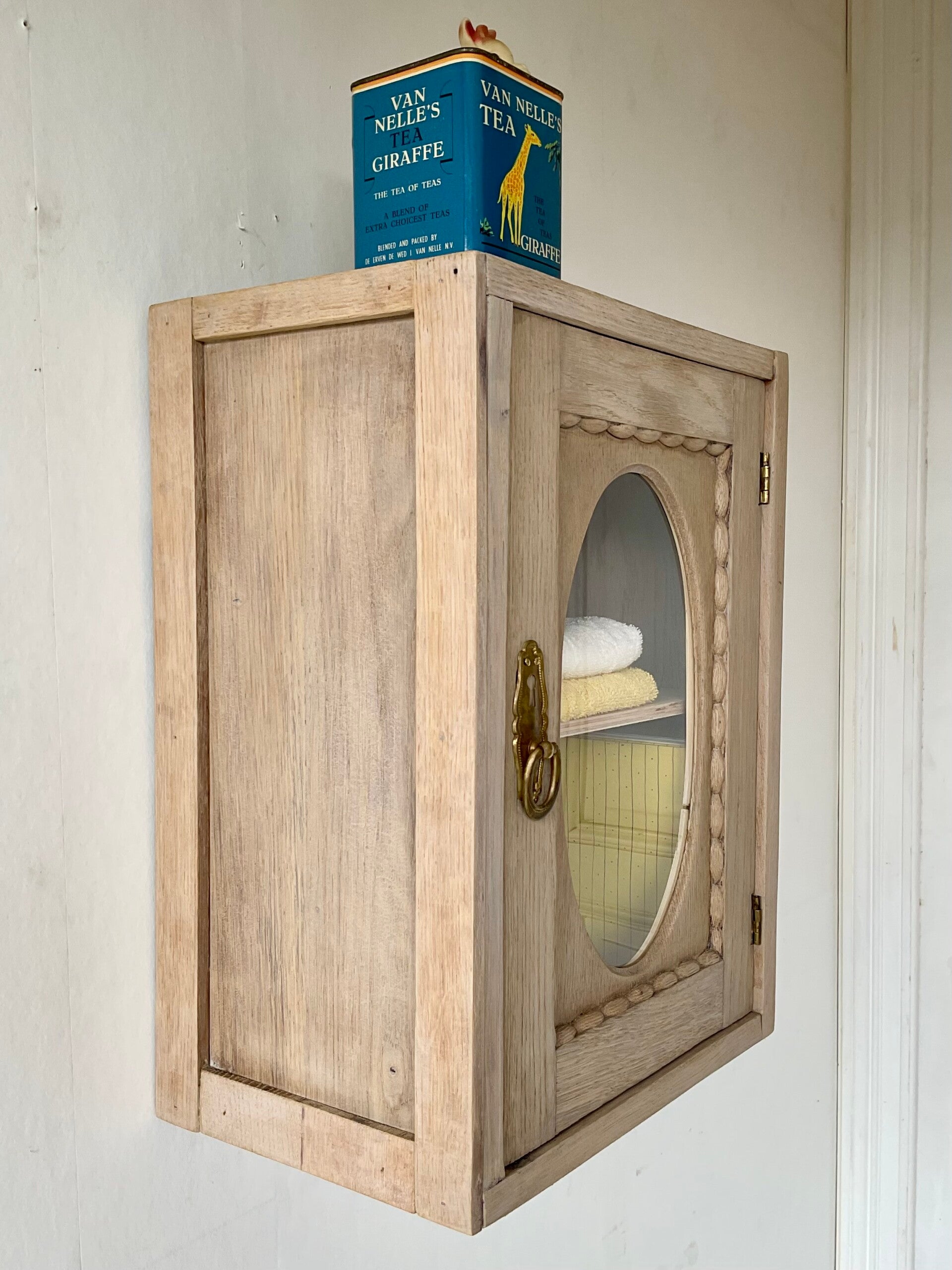 Dit eikenhouten kastje heeft een linksdraaiend deurtje met plexiglas.